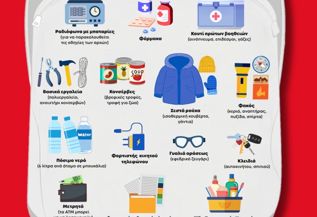 Ο Ελληνικός Ερυθρός Σταυρός (Ε.Ε.Σ.), στο πλαίσιο της διαρκούς ενημέρωσης και εκπαίδευσης των πολιτών για την αντιμετώπιση έκτακτων καταστάσεων, προτείνει τα απαραίτητα είδη που θα πρέπει να περιλαμβάνει ένα σακίδιο επιβίωσης. Βίντεο του Ε.Ε.Σ. εδώ To σακίδιο θα πρέπει να περιλαμβάνει τα εξής: Ραδιόφωνο με μπαταρίες (και εφεδρικές μπαταρίες) για να παρακολουθείτε τις οδηγίες των