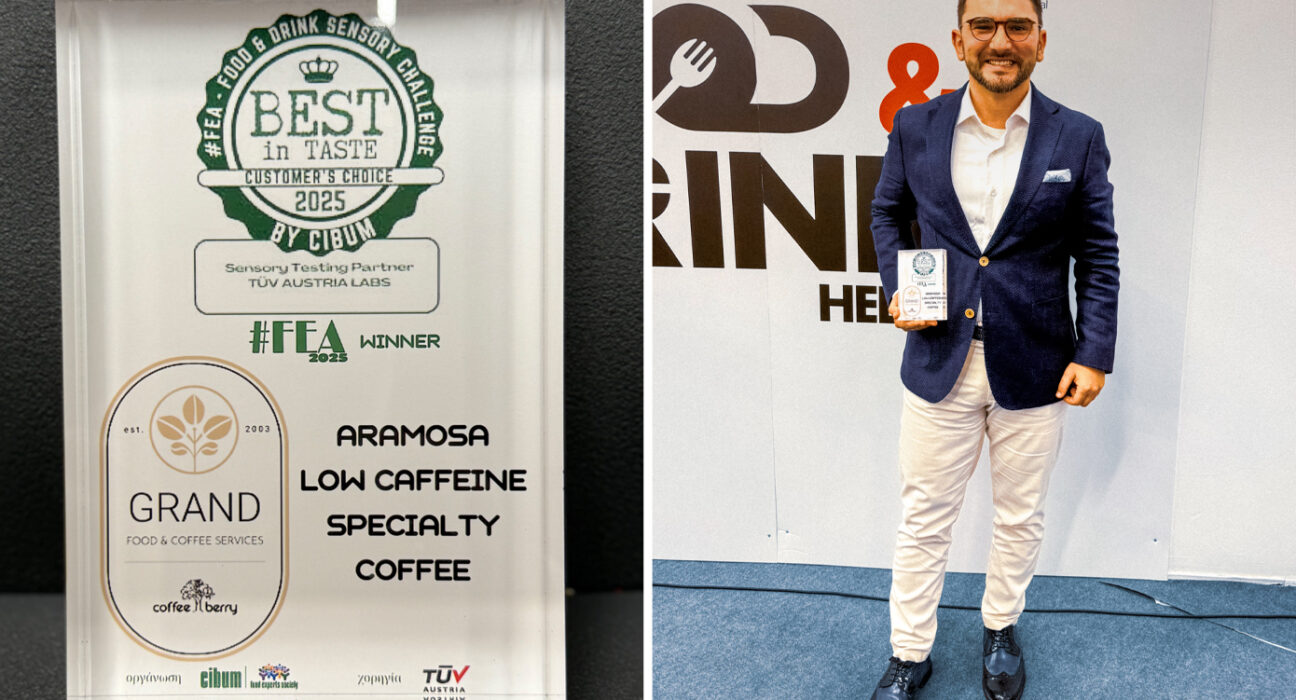 Η Coffee Berry, η πλέον δυναμική ελληνική εταιρεία καφέ, παρουσίασε, για πρώτη φορά στην ελληνική αγορά, μια ειδική ποικιλία καφέ, τον Aramosa Specialty Coffee – Low Caffeine, με φυσικά χαμηλότερη καφεΐνη, αποσπώντας το σχετικό βραβείο στα Best in Taste – Food Experts’ Awards 2025, που διοργανώνονται από το εξειδικευμένο portal Cibum. Ο Aramosa Specialty Coffee -Low Caffeine, που παρουσιάστηκε αποκλειστικά από την Coffee Berry στην Ελλάδα, στο φετινό Athens Coffee Festival, αποτελεί ένα σπάνιο υβρίδιο Coffea Arabica και Coffea Racemosa και έναν από τους πιο καινοτόμους καφέδες της γενιάς του, συνδυάζοντας λιγότερη καφεΐνη με πλούσια γεύση. Καλλιεργείται με σεβασμό στη βιωσιμότητα, τη φυσική ανθεκτικότητα και την απόδοση εξαιρετικής γεύσης, προσφέροντας μια πρωτοπόρα εμπειρία με φυσικά χαμηλή περιεκτικότητα σε καφεΐνη, χωρίς συμβιβασμούς στο άρωμα ή στην απόλαυση. Τα Food Experts’ Awards 2025 αποτελούν μια ετήσια διοργάνωση που αναδεικνύει την κορυφαία καινοτομία και ποιότητα στον κλάδο των τροφίμων και ποτών στην Ελλάδα. Διοργανώνονται από το εξειδικευμένο portal Cibum, με την υποστήριξη της […] Η Coffee Berry, η πλέον δυναμική ελληνική εταιρεία καφέ, παρουσίασε, για πρώτη φορά στην ελληνική αγορά, μια ειδική ποικιλία καφέ, τον Aramosa Specialty Coffee – Low Caffeine, με φυσικά χαμηλότερη καφεΐνη, αποσπώντας το σχετικό βραβείο στα Best in Taste – Food Experts’ Awards 2025, που διοργανώνονται από το εξειδικευμένο portal Cibum. Ο Aramosa Specialty Coffee -Low Caffeine, που παρουσιάστηκε αποκλειστικά από την Coffee Berry στην Ελλάδα, στο φετινό Athens Coffee Festival, αποτελεί ένα σπάνιο υβρίδιο Coffea Arabica και Coffea Racemosa και έναν από τους πιο καινοτόμους καφέδες της γενιάς του, συνδυάζοντας λιγότερη καφεΐνη με πλούσια γεύση. Καλλιεργείται με σεβασμό στη βιωσιμότητα, τη φυσική ανθεκτικότητα και την απόδοση εξαιρετικής γεύσης, προσφέροντας μια πρωτοπόρα εμπειρία με φυσικά χαμηλή περιεκτικότητα σε καφεΐνη, χωρίς συμβιβασμούς στο άρωμα ή στην απόλαυση. Τα Food Experts’ Awards 2025 αποτελούν μια ετήσια διοργάνωση που αναδεικνύει την κορυφαία καινοτομία και ποιότητα στον κλάδο των τροφίμων και ποτών στην Ελλάδα. Διοργανώνονται από το εξειδικευμένο portal Cibum, με την υποστήριξη της ΕΠΙΧΕΙΡΗΣΕΙΣ, ΟΙΚΟΝΟΜΙΑ, καφές