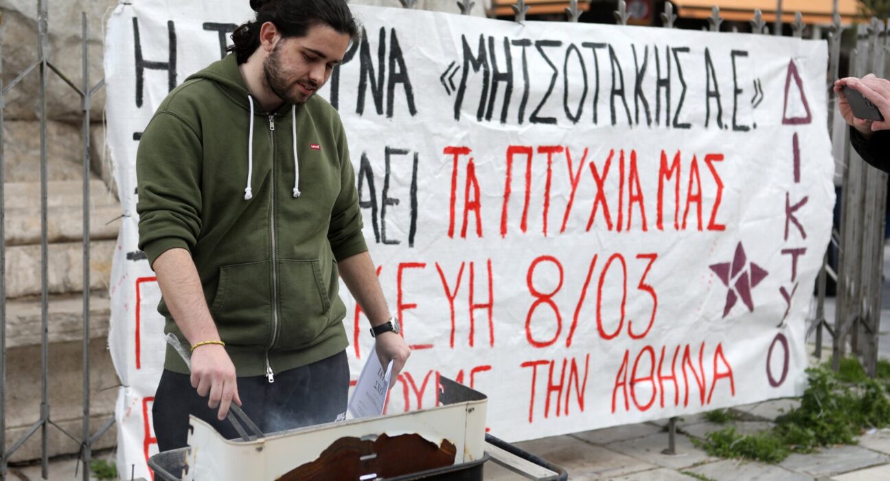 [[{“value”:”Σε μια συμβολική δράση προχώρησαν φοιτητές και φοιτήτριες λόγω Τσικνοπέμπτης, μια μέρα πριν από την ψήφιση του νομοσχεδίου του υπουργείου Παιδείας για την ίδρυση μη κρατικών πανεπιστημίων.