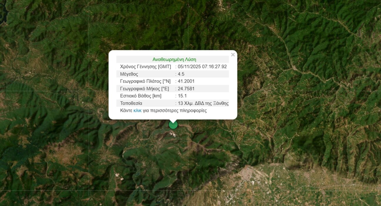 Σεισμός μεγέθους 4,5 Ρίχτερ σημειώθηκε το πρωί της Τετάρτης (11/05) 13 χιλιόμετρα δυτικά της Ξάνθης. Σύμφωνα με την αναθεωρημένη λύση του Γεωδυναμικού Ινστιτούτου η σεισμική δόνηση εντοπίστηκε σε βάθος 15,1 χιλιομέτρων, ενώ έγινε αισθητή στην ευρύτερη περιοχή. Το Ευρωμεσογειακό Ινστιτούτο στη μέτρησή του αναφέρει ότι ο σεισμός ήταν μεγέθους 4,7 βαθμών της κλίμακας Ρίχτερ. Σεισμός μεγέθους 4,5 Ρίχτερ σημειώθηκε το πρωί της Τετάρτης (11/05) 13 χιλιόμετρα δυτικά της Ξάνθης. Σύμφωνα με την αναθεωρημένη λύση του Γεωδυναμικού Ινστιτούτου η σεισμική δόνηση εντοπίστηκε σε βάθος 15,1 χιλιομέτρων, ενώ έγινε αισθητή στην ευρύτερη περιοχή. Το Ευρωμεσογειακό Ινστιτούτο στη μέτρησή του αναφέρει ότι ο σεισμός ήταν μεγέθους 4,7 βαθμών της κλίμακας Ρίχτερ. ΕΛΛΑΔΑ, Ξάνθη, σεισμός, σεισμός τώρα