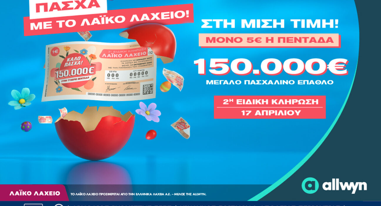 Το Λαϊκό Λαχείο παραμένει σε εορταστικό κλίμα και μοιράζει Πασχαλινό έπαθλο ύψους 150.000 ευρώ στην ειδική κλήρωση που θα πραγματοποιηθεί την Παρασκευή 17 Απριλίου. Οι παίκτες μπορούν να προμηθεύονται τους λαχνούς τους μέσω του δικτύου καταστημάτων Allwyn και των λαχειοπωλών όλης της Ελλάδας, στη μισή τιμή από την κανονική έκδοση, με την πεντάδα να κοστίζει 5 ευρώ. Το μεγάλο έπαθλο και τα μικρότερα κέρδη Εκτός από το έπαθλο των 150.000 ευρώ στην τυχερή πεντάδα, η δεύτερη ειδική κλήρωση του Λαϊκού Λαχείου για το 2026 μοιράζει στους παίκτες και άλλα, μικρότερα έπαθλα. Συγκεκριμένα, από 5.000 ευρώ κερδίζουν οι λαχνοί που διαθέτουν τον ίδιο αριθμό με τον τυχερό λαχνό σε όλες τις άλλες σειρές. Από εκεί και πέρα, 200 ευρώ κερδίζουν οι δέκα πρώτοι λαχνοί από τους 119 λαχνούς κάθε σειράς που θα προκύψουν αυτόματα από τον τυχερό λαχνό της κλήρωσης, ενώ από 100 ευρώ οι υπόλοιποι 109. Επίσης, 10 ευρώ κερδίζουν όσες πεντάδες έχουν τον ίδιο τελευταίο αριθμό με το νικητήριο λήγοντα. Δυνατότητα […] Το Λαϊκό Λαχείο παραμένει σε εορταστικό κλίμα και μοιράζει Πασχαλινό έπαθλο ύψους 150.000 ευρώ στην ειδική κλήρωση που θα πραγματοποιηθεί την Παρασκευή 17 Απριλίου. Οι παίκτες μπορούν να προμηθεύονται τους λαχνούς τους μέσω του δικτύου καταστημάτων Allwyn και των λαχειοπωλών όλης της Ελλάδας, στη μισή τιμή από την κανονική έκδοση, με την πεντάδα να κοστίζει 5 ευρώ. Το μεγάλο έπαθλο και τα μικρότερα κέρδη Εκτός από το έπαθλο των 150.000 ευρώ στην τυχερή πεντάδα, η δεύτερη ειδική κλήρωση του Λαϊκού Λαχείου για το 2026 μοιράζει στους παίκτες και άλλα, μικρότερα έπαθλα. Συγκεκριμένα, από 5.000 ευρώ κερδίζουν οι λαχνοί που διαθέτουν τον ίδιο αριθμό με τον τυχερό λαχνό σε όλες τις άλλες σειρές. Από εκεί και πέρα, 200 ευρώ κερδίζουν οι δέκα πρώτοι λαχνοί από τους 119 λαχνούς κάθε σειράς που θα προκύψουν αυτόματα από τον τυχερό λαχνό της κλήρωσης, ενώ από 100 ευρώ οι υπόλοιποι 109. Επίσης, 10 ευρώ κερδίζουν όσες πεντάδες έχουν τον ίδιο τελευταίο αριθμό με το νικητήριο λήγοντα. Δυνατότητα […] ΕΛΛΑΔΑ, Λαϊκό Λαχείο