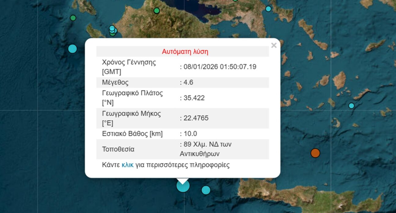 Σεισμός μεγέθους 4,6 της κλίμακας Ρίχτερ σημειώθηκε τα ξημερώματα της Πέμπτης 08/01 σε θαλάσσια περιοχή δυτικά της Κρήτης, σύμφωνα με την αναθεωρημένη εκτίμηση του Γεωδυναμικού Ινστιτούτου. Η δόνηση καταγράφηκε στις 03:50, ενώ το εστιακό της βάθος υπολογίζεται στα 8 χιλιόμετρα. Το επίκεντρο προσδιορίζεται περίπου 91 χιλιόμετρα νοτιοδυτικά των Αντικυθήρων. Το Newsbeast παρακολουθεί όλες τις εξελίξεις και θα σας ενημερώσει για όλα τα νεότερα. Σεισμός στην Ελλάδα και στον κόσμο: Ενημερωθείτε άμεσα για όλα όσα συμβαίνουν. Σεισμός μεγέθους 4,6 της κλίμακας Ρίχτερ σημειώθηκε τα ξημερώματα της Πέμπτης 08/01 σε θαλάσσια περιοχή δυτικά της Κρήτης, σύμφωνα με την αναθεωρημένη εκτίμηση του Γεωδυναμικού Ινστιτούτου. Η δόνηση καταγράφηκε στις 03:50, ενώ το εστιακό της βάθος υπολογίζεται στα 8 χιλιόμετρα. Το επίκεντρο προσδιορίζεται περίπου 91 χιλιόμετρα νοτιοδυτικά των Αντικυθήρων. Το Newsbeast παρακολουθεί όλες τις εξελίξεις και θα σας ενημερώσει για όλα τα νεότερα. Σεισμός στην Ελλάδα και στον κόσμο: Ενημερωθείτε άμεσα για όλα όσα συμβαίνουν. ΕΛΛΑΔΑ, Κρήτη, σεισμός, σεισμός τώρα