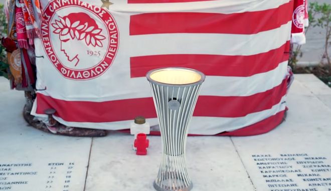 Ολυμπιακός: Το τρόπαιο του Conference League στο μνημείο της Θύρας 7 και στα μνήματα Μιλτιάδη Μαρινάκη και Σάββα Θεοδωρίδη