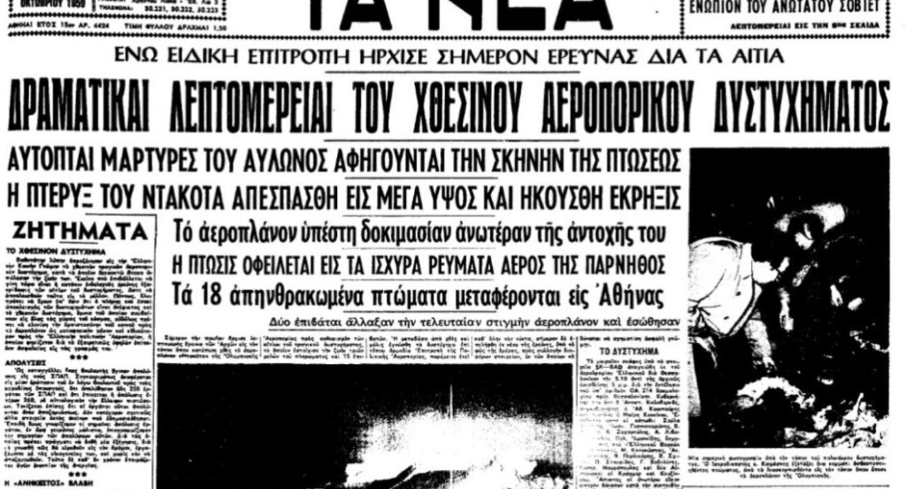 Σαν σήμερα το 1959, η Ελλάδα βυθίζεται στο πένθος από μία από τις πιο τραγικές αεροπορικές καταστροφές της ιστορίας της. Το αεροσκάφος τύπου Douglas DC-3 της Ολυμπιακής Αεροπορίας, που εκτελούσε το δρομολόγιο Αθήνα – Θεσσαλονίκη, συνετρίβη λίγα μόλις λεπτά μετά την απογείωσή του από το αεροδρόμιο του Ελληνικού. Και οι 18 επιβαίνοντες – επιβάτες και πλήρωμα – έχασαν τη ζωή τους. Το αεροπλάνο απογειώθηκε κανονικά λίγο μετά τις 7 το πρωί, με προορισμό τη Θεσσαλονίκη, όμως πέντε λεπτά αργότερα χάθηκε από τα ραντάρ. Οι πρώτες αναφορές ήρθαν από κατοίκους της περιοχής του Αυλώνα, οι οποίοι είπαν ότι άκουσαν «μια δυνατή έκρηξη στον αέρα» και στη συνέχεια είδαν «φλόγες να κατεβαίνουν προς το έδαφος». Τα σωστικά συνεργεία που έφτασαν στην περιοχή αντίκρισαν ένα φλεγόμενο πεδίο συντριμμιών και ανθρώπινα σώματα διασκορπισμένα μέσα στις φλόγες. Αυτόπτες μάρτυρες υποστήριξαν ότι το ένα φτερό του αεροσκάφους αποκολλήθηκε πριν την πρόσκρουση, γεγονός που ενίσχυσε τις υποψίες πως προηγήθηκε έκρηξη στη δεξαμενή καυσίμων. Οι ειδικοί που μετέβησαν […] Σαν σήμερα το 1959, η Ελλάδα βυθίζεται στο πένθος από μία από τις πιο τραγικές αεροπορικές καταστροφές της ιστορίας της. Το αεροσκάφος τύπου Douglas DC-3 της Ολυμπιακής Αεροπορίας, που εκτελούσε το δρομολόγιο Αθήνα – Θεσσαλονίκη, συνετρίβη λίγα μόλις λεπτά μετά την απογείωσή του από το αεροδρόμιο του Ελληνικού. Και οι 18 επιβαίνοντες – επιβάτες και πλήρωμα – έχασαν τη ζωή τους. Το αεροπλάνο απογειώθηκε κανονικά λίγο μετά τις 7 το πρωί, με προορισμό τη Θεσσαλονίκη, όμως πέντε λεπτά αργότερα χάθηκε από τα ραντάρ. Οι πρώτες αναφορές ήρθαν από κατοίκους της περιοχής του Αυλώνα, οι οποίοι είπαν ότι άκουσαν «μια δυνατή έκρηξη στον αέρα» και στη συνέχεια είδαν «φλόγες να κατεβαίνουν προς το έδαφος». Τα σωστικά συνεργεία που έφτασαν στην περιοχή αντίκρισαν ένα φλεγόμενο πεδίο συντριμμιών και ανθρώπινα σώματα διασκορπισμένα μέσα στις φλόγες. Αυτόπτες μάρτυρες υποστήριξαν ότι το ένα φτερό του αεροσκάφους αποκολλήθηκε πριν την πρόσκρουση, γεγονός που ενίσχυσε τις υποψίες πως προηγήθηκε έκρηξη στη δεξαμενή καυσίμων. Οι ειδικοί που μετέβησαν ΕΛΛΑΔΑ, ΚΟΣΜΟΣ, αεροπορικό δυστύχημα, Σαν σήμερα