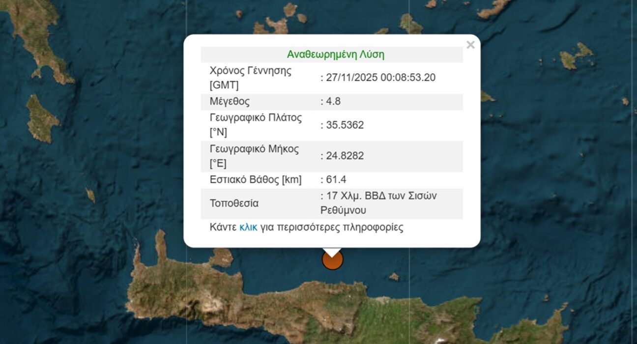 Σεισμός 4,8 Ρίχτερ σε θαλάσσια περιοχή της Κρήτης