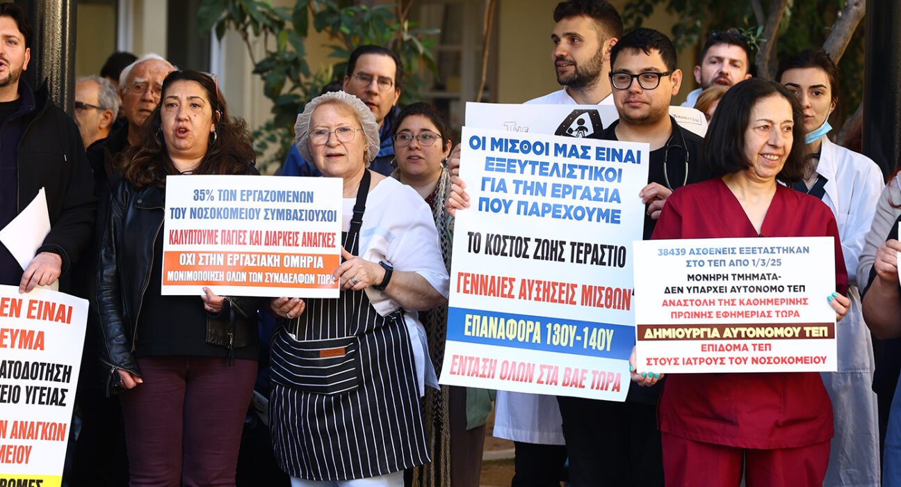 Συγκέντρωση διαμαρτυρίας εργαζομένων του νοσοκομείου «Παμμακάριστος» στα εγκαίνια του ΤΕΠ από τον Άδωνι Γεωργιάδη