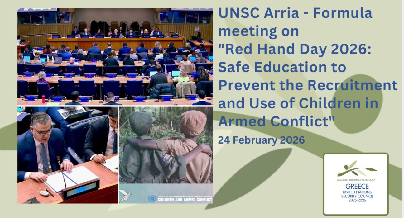 Συνεδρίαση τύπου Arria-Formula έλαβε χώρα στην έδρα του ΟΗΕ, η οποία συγκλήθηκε από τον Παναμά με την υποστήριξη της Ελλάδας, της Αυστρίας, της Ιαπωνίας, της Ουρουγουάης και της Λιβερίας με αφορμή τη Red Hand Day. Κεντρικός άξονας της συνεδρίασης ήταν ότι «η εκπαίδευση αποτελεί θεμελιώδες δικαίωμα αλλά και στρατηγικό εργαλείο για την πρόληψη της στρατολόγησης και χρήσης παιδιών σε ένοπλες συγκρούσεις». Κατά τη διάρκεια της συνεδρίασης τονίστηκε ότι η ασφαλής, χωρίς αποκλεισμούς και συνεχής εκπαίδευση μειώνει την αδυναμία των παιδιών στη στρατολόγηση και συνιστά βασικό πυλώνα για τη βιώσιμη επανένταξη των παιδιών που πλήττονται από συγκρούσεις. Υπενθυμίστηκε ότι η Red Hand Day τηρείται ετησίως από το 2002, σηματοδοτώντας την έναρξη ισχύος του Προαιρετικού Πρωτοκόλλου της Σύμβασης για τα Δικαιώματα του Παιδιού σχετικά με τη συμμετοχή παιδιών σε ένοπλες συγκρούσεις, το οποίο απαγορεύει τη στρατολόγηση και χρήση ατόμων κάτω των 18 ετών και ενισχύει τις υποχρεώσεις προστασίας. Έγινε επίσης αναφορά στο ευρύτερο διεθνές νομικό πλαίσιο προστασίας των παιδιών, συμπεριλαμβανομένου του διεθνούς […] Συνεδρίαση τύπου Arria-Formula έλαβε χώρα στην έδρα του ΟΗΕ, η οποία συγκλήθηκε από τον Παναμά με την υποστήριξη της Ελλάδας, της Αυστρίας, της Ιαπωνίας, της Ουρουγουάης και της Λιβερίας με αφορμή τη Red Hand Day. Κεντρικός άξονας της συνεδρίασης ήταν ότι «η εκπαίδευση αποτελεί θεμελιώδες δικαίωμα αλλά και στρατηγικό εργαλείο για την πρόληψη της στρατολόγησης και χρήσης παιδιών σε ένοπλες συγκρούσεις». Κατά τη διάρκεια της συνεδρίασης τονίστηκε ότι η ασφαλής, χωρίς αποκλεισμούς και συνεχής εκπαίδευση μειώνει την αδυναμία των παιδιών στη στρατολόγηση και συνιστά βασικό πυλώνα για τη βιώσιμη επανένταξη των παιδιών που πλήττονται από συγκρούσεις. Υπενθυμίστηκε ότι η Red Hand Day τηρείται ετησίως από το 2002, σηματοδοτώντας την έναρξη ισχύος του Προαιρετικού Πρωτοκόλλου της Σύμβασης για τα Δικαιώματα του Παιδιού σχετικά με τη συμμετοχή παιδιών σε ένοπλες συγκρούσεις, το οποίο απαγορεύει τη στρατολόγηση και χρήση ατόμων κάτω των 18 ετών και ενισχύει τις υποχρεώσεις προστασίας. Έγινε επίσης αναφορά στο ευρύτερο διεθνές νομικό πλαίσιο προστασίας των παιδιών, συμπεριλαμβανομένου του διεθνούς ΕΛΛΑΔΑ, ΚΟΣΜΟΣ, παιδιά, στρατολόγηση