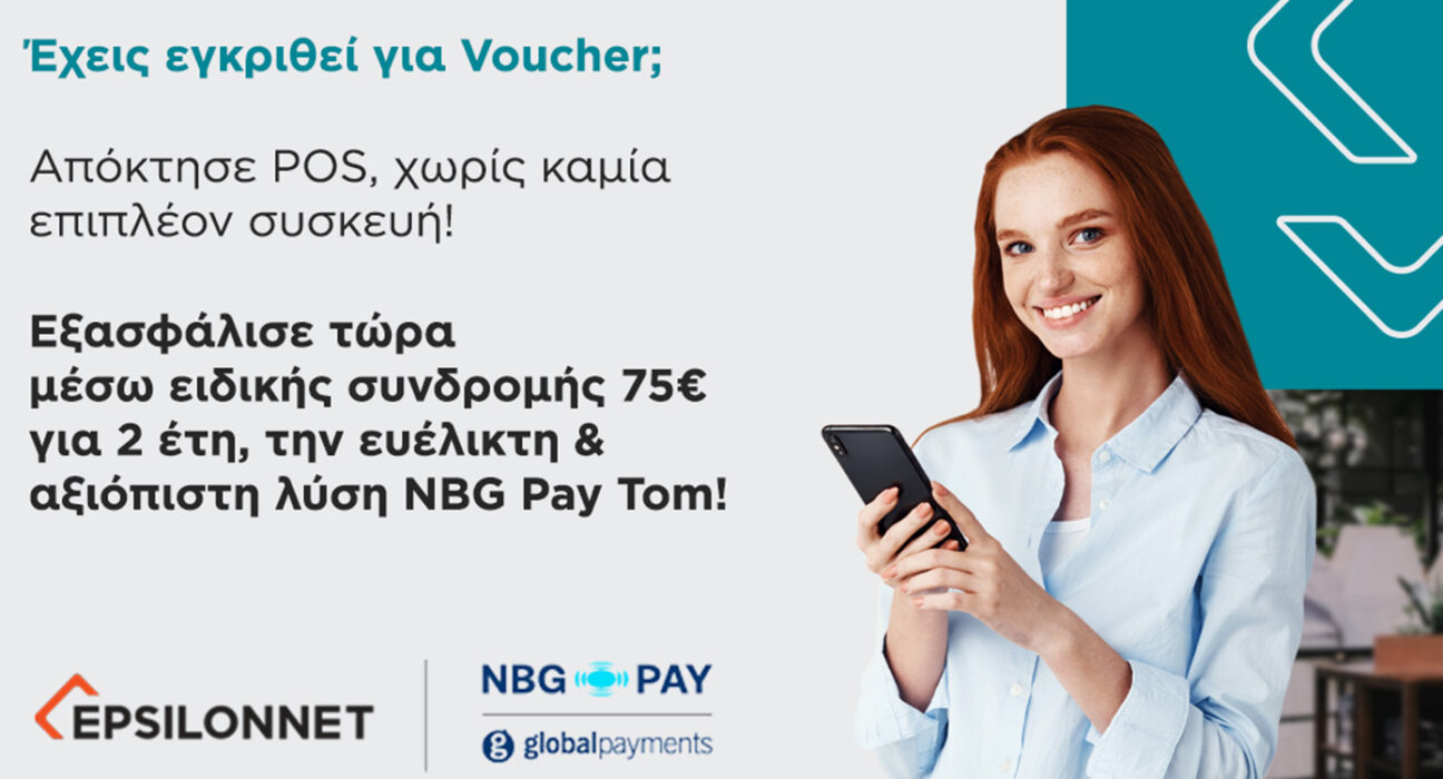 Η καινοτόμος λύση NBG Pay tom, αποτέλεσμα της συνεργασίας της NBG Pay – με την υποστήριξη της Εθνικής Τράπεζας – και του Ομίλου EPSILONNET, διατίθεται πλέον και μέσω του προγράμματος «Ψηφιακές Συναλλαγές – Β’ Φάση» του Εθνικού Σχεδίου Ανάκαμψης και Ανθεκτικότητας «Ελλάδα 2.0». Οι δικαιούχοι της Κατηγορίας 1 του προγράμματος έχουν τη δυνατότητα να αποκτήσουν το NBG Pay tom μέσω ειδικής διετούς συνδρομής 75€, η οποία παρέχεται από την EPSILONNET και επιδοτείται εξ ολοκλήρου (100%) μέσω της ψηφιακής επιταγής (Voucher). Πρακτικά, με μηδενικό κόστος, οι επαγγελματίες έχουν πρόσβαση σε μια σύγχρονη, αξιόπιστη και ολοκληρωμένη λύση Soft POS, που συμβάλλει στον ψηφιακό μετασχηματισμό της επιχείρησης, ενισχύει την ταχύτητα και την ασφάλεια των συναλλαγών, ενώ διασυνδέεται άμεσα με τα συστήματα ηλεκτρονικής τιμολόγησης. Το NBG Pay tom επιτρέπει την αποδοχή πληρωμών απευθείας από το κινητό ή το tablet, χωρίς πρόσθετο εξοπλισμό, αξιοποιώντας τη συσκευή που ήδη χρησιμοποιείται για την έκδοση παραστατικών. Η πλήρης ενσωμάτωση με τα λογισμικά τιμολόγησης του Ομίλου EPSILONNET προσφέρει ένα […] Η καινοτόμος λύση NBG Pay tom, αποτέλεσμα της συνεργασίας της NBG Pay – με την υποστήριξη της Εθνικής Τράπεζας – και του Ομίλου EPSILONNET, διατίθεται πλέον και μέσω του προγράμματος «Ψηφιακές Συναλλαγές – Β’ Φάση» του Εθνικού Σχεδίου Ανάκαμψης και Ανθεκτικότητας «Ελλάδα 2.0». Οι δικαιούχοι της Κατηγορίας 1 του προγράμματος έχουν τη δυνατότητα να αποκτήσουν το NBG Pay tom μέσω ειδικής διετούς συνδρομής 75€, η οποία παρέχεται από την EPSILONNET και επιδοτείται εξ ολοκλήρου (100%) μέσω της ψηφιακής επιταγής (Voucher). Πρακτικά, με μηδενικό κόστος, οι επαγγελματίες έχουν πρόσβαση σε μια σύγχρονη, αξιόπιστη και ολοκληρωμένη λύση Soft POS, που συμβάλλει στον ψηφιακό μετασχηματισμό της επιχείρησης, ενισχύει την ταχύτητα και την ασφάλεια των συναλλαγών, ενώ διασυνδέεται άμεσα με τα συστήματα ηλεκτρονικής τιμολόγησης. Το NBG Pay tom επιτρέπει την αποδοχή πληρωμών απευθείας από το κινητό ή το tablet, χωρίς πρόσθετο εξοπλισμό, αξιοποιώντας τη συσκευή που ήδη χρησιμοποιείται για την έκδοση παραστατικών. Η πλήρης ενσωμάτωση με τα λογισμικά τιμολόγησης του Ομίλου EPSILONNET προσφέρει ένα ΟΙΚΟΝΟΜΙΑ